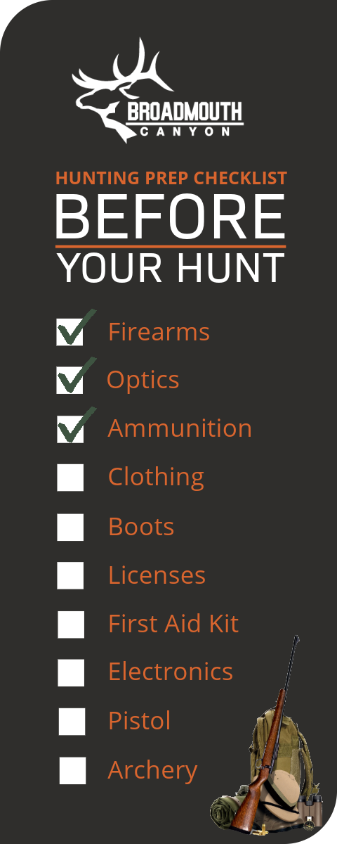 Integrating this hunting checklist list into your pre-trip preparations will ensure you are well-prepared for a successful and enjoyable hunting experience at Broadmouth Canyon Ranch. Ensure to review and adjust your packing list based on the specific requirements of your hunt and the expected weather conditions.